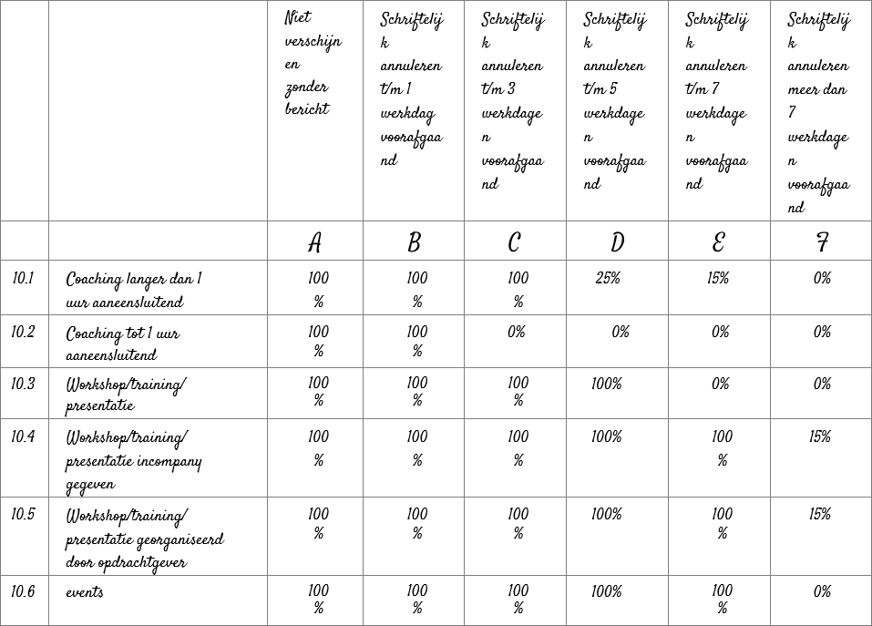 10.1. Indien de opdracht, om redenen die niet aan Coaching ‘t Verschil toe te rekenen zijn, door opdrachtgever niet wordt afgenomen op het overeengekomen tijdstip dan gelden de volgende annuleringsvoorwaarden: